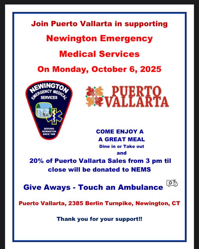 FUNDRAISER: Newington Emergency Medical Services + Add to Google Calendar + iCal / Outlook export Date Oct 06 2025 Expired! Time 3:00 pm - 10:00 pm Share this event